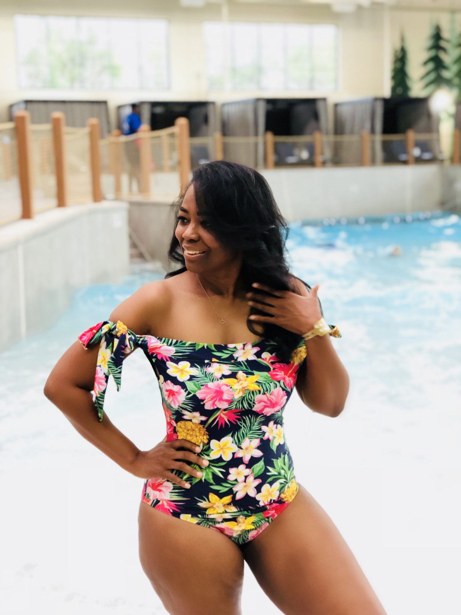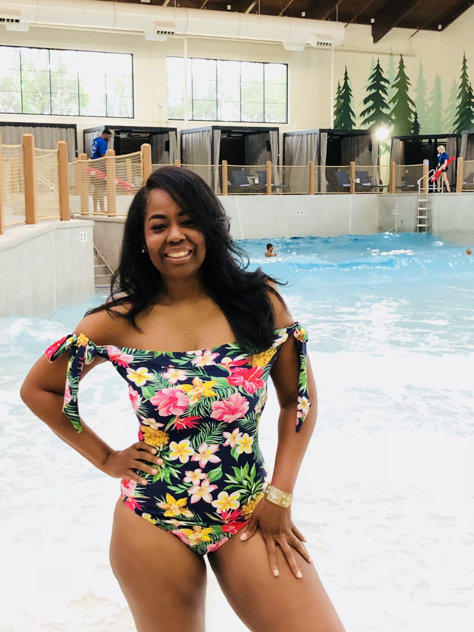 What a wonderful weekend I had with my family! We visited Great Wolf Lodge for the very first time and boy did we have fun! I told you guys that this summer I was going to stay in a swimsuit and I haven’t let you down as of yet lol. Its been in the high 90’s here in Atlanta and this suit I’m wearing pictured here came in handy for the warm weather and the indoor waterpark! I love anything off the shoulder and the colors popped, which I loved! More pics and where to find inside, enjoy your day everyone!