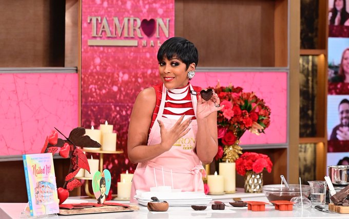 On the Tamron Hall Show today, it was all about LOVE! Tamron talked to adorable couples, making Valentine’s Day sweets with pastry chef and chocolatier Jacques Torres and so much more! What caught my attention was her sexy fitted red & white bodycon dress that was simply amazing!