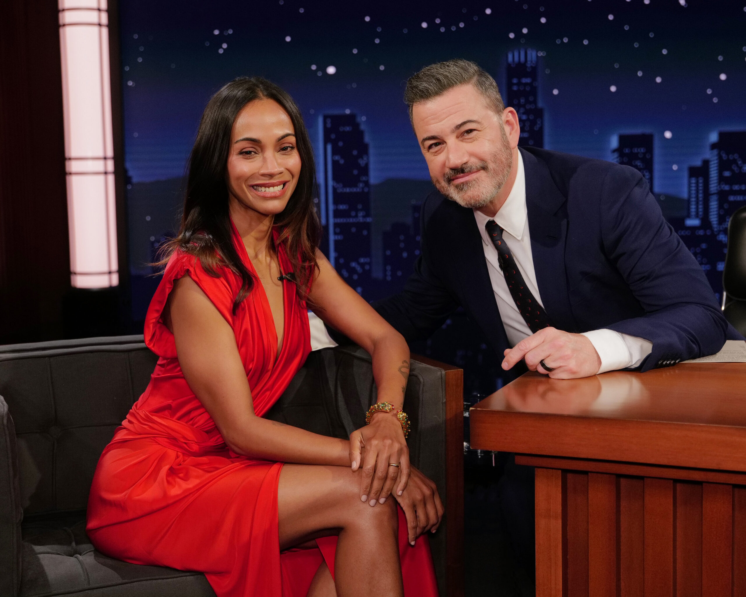 Zoe talks about her twin boys’ birthday being on Thanksgiving, her mom being a character and embarrassing her a lot, meeting Pope Leo with her family, Avatar: Fire and Ash, riding stunt men with saddles on them, and she teaches Jimmy how to shoot an arrow. See more photos and video clip inside..